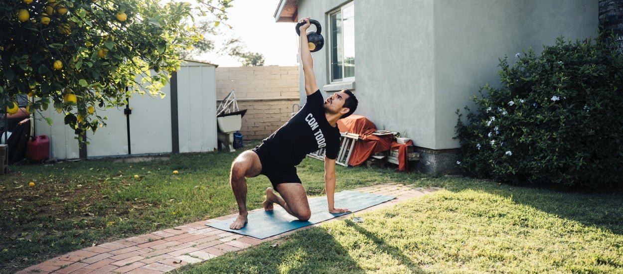 Bending your knees, lower down onto your left knee so that you’re kneeling on just one leg. The other leg should be positioned in a 90-degree angle.