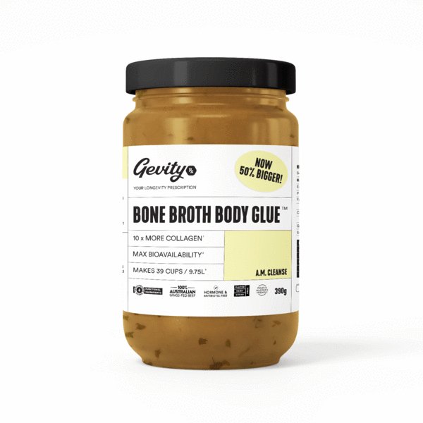 Gevity RX Bone Broth Body Glue is made using 100% grass-fed Australian beef bones and naturally evaporated sea salt and offers 10x more collagen and maximum bioavailability.