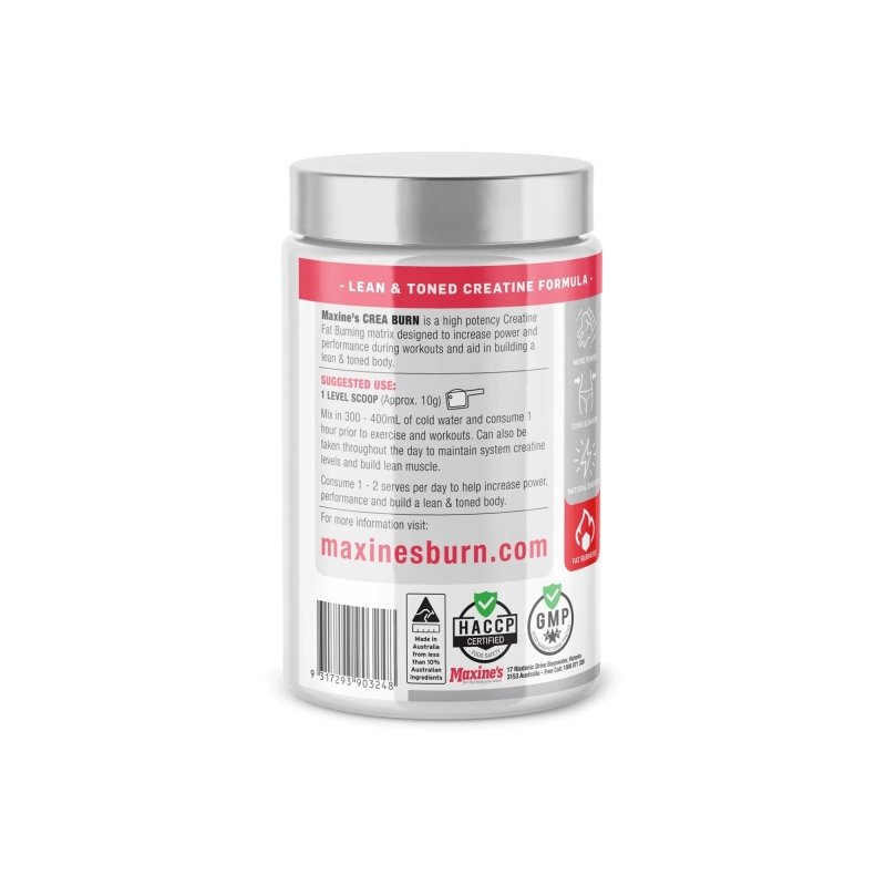 Maxine’s CREA BURN is a high-potency creatine supplement designed to boost power and performance while supporting lean muscle growth. With added natural fat metabolizers, it helps you burn fat faster, making it the perfect choice for those aiming for a lean, toned, and strong body.