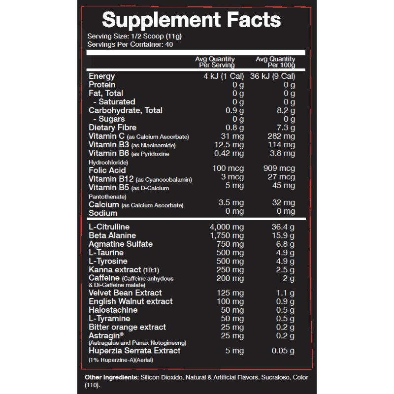 This powerful formula includes L-Tyrosine, L-Theanine, and Huperzine A to sharpen your focus and mental clarity, ensuring you stay dialed in throughout your workout. The addition of Kanna Extract, Velvet Bean, and Bitter Orange Extract helps elevate mood and motivation, making it perfect for those days when you need an extra push.