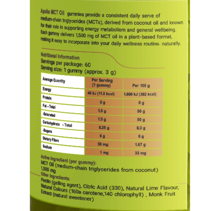 Apollo MCT Oil Gummies are designed to make daily MCT intake simple, tasty, and accessible. Each gummy contains premium coconut-derived MCT oil, a clean and fast-utilised form of dietary fat that’s popular for energy support and balanced nutrition.
