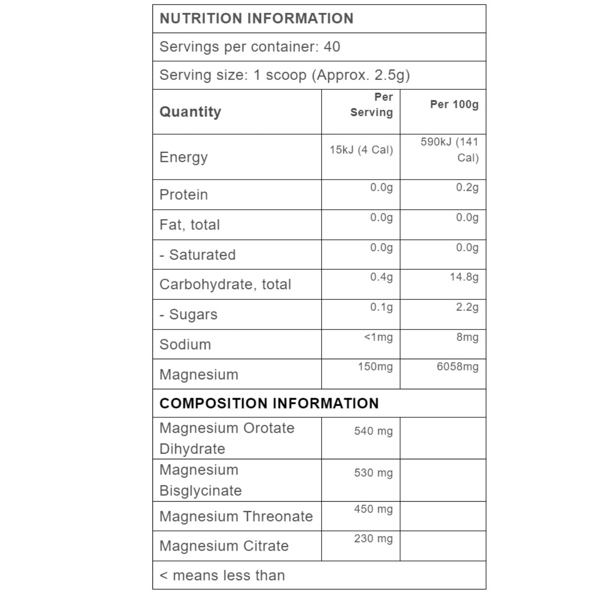 Each serve delivers a precise combination of Magnesium Orotate, Threonate, Bisglycinate, and Citrate, all chosen for their bioavailability and specific benefits. Magnesium plays a key role in supporting energy metabolism, muscle relaxation, and electrolyte balance, and may help reduce muscle cramps, tiredness, and signs of fatigue when dietary intake is inadequate.