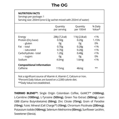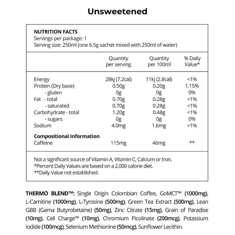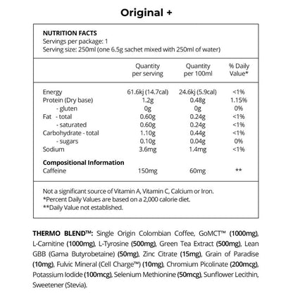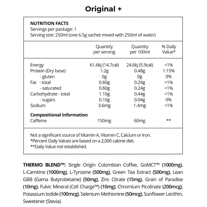 WARNING: Contains Caffeine. This product is not intended or recommended for children under 15 years of age, pregnant or lactating women. Those with a medical condition and those taking medication should consult a healthcare professional. Made in a facility that also produces products containing Soy, Egg, Nuts and Seeds. Store below 30°C. Do not use if the sachet is damaged or open.