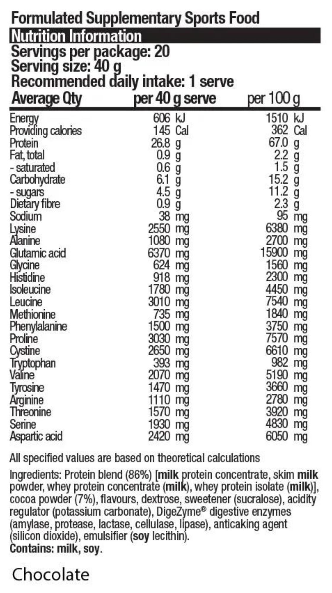 Post-workout recovery: 2 scoops (40 g) with water or milk (and milk alternatives) 15min after training.