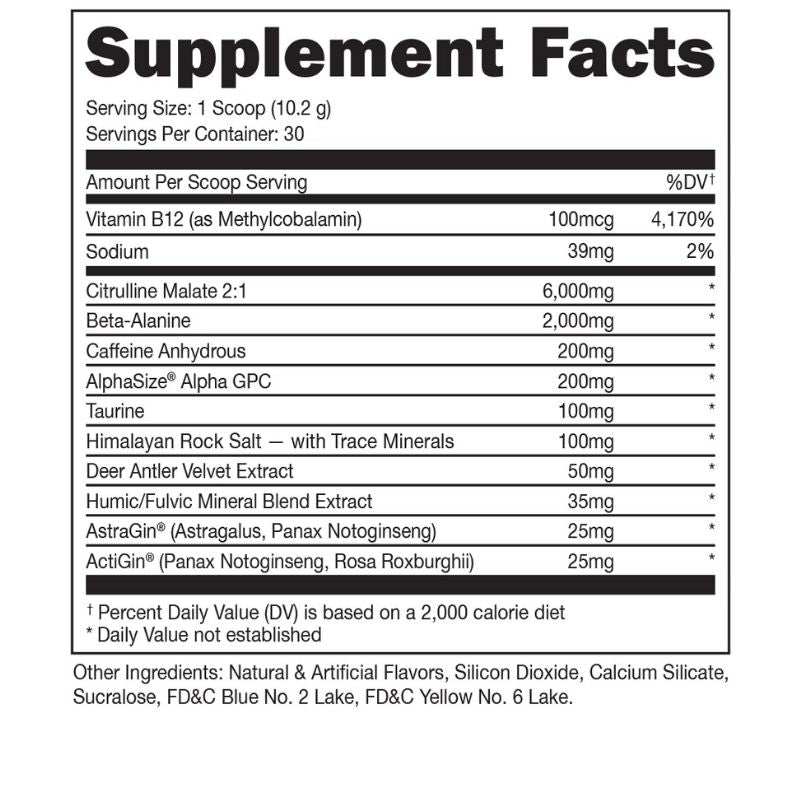 With the inclusion of Citrulline Malate and Beta-Alanine, Bucked Up BLACK promotes nitric oxide production, enhancing blood flow for intense muscle pumps and delaying fatigue to help you push harder. Meanwhile, Caffeine Anhydrous and AlphaSize® Alpha GPC provide sustained energy and sharp mental focus, keeping you locked in and ready to dominate every session.