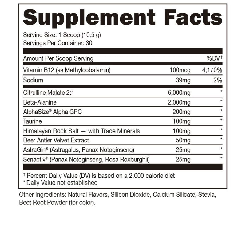 To support mental clarity and focus, AlphaSize® and Vitamin B12 are included, ensuring you stay sharp and motivated throughout your session. Additionally, Senactiv® and Deer Antler Velvet may contribute to recovery and performance, making this pre-workout an all-in-one solution for serious training. Himalayan Rock Salt and Sodium help maintain electrolyte balance, ensuring optimal hydration and muscle function.