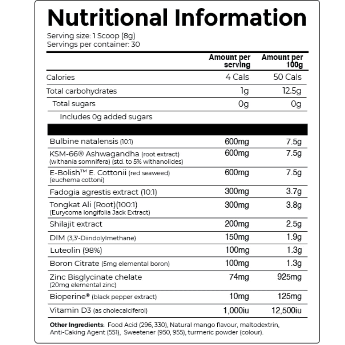 At the core of this formula are 11 botanicals and nutrients designed to support daily recovery and resilience. KSM-66® Ashwagandha has been studied for its role in helping the body adapt to physical and mental stress. Tongkat Ali, Fadogia Agrestis, and Bulbine natalensis are traditionally used in male vitality blends for their supportive effects on energy and drive. The inclusion of Zinc bisglycinate, Vitamin D3, and Boron citrate helps support nutrient pathways involved in muscle function, immune health, and metabolic support. DIM and Luteolin round out the blend with support for healthy estrogen metabolism and systemic balance.