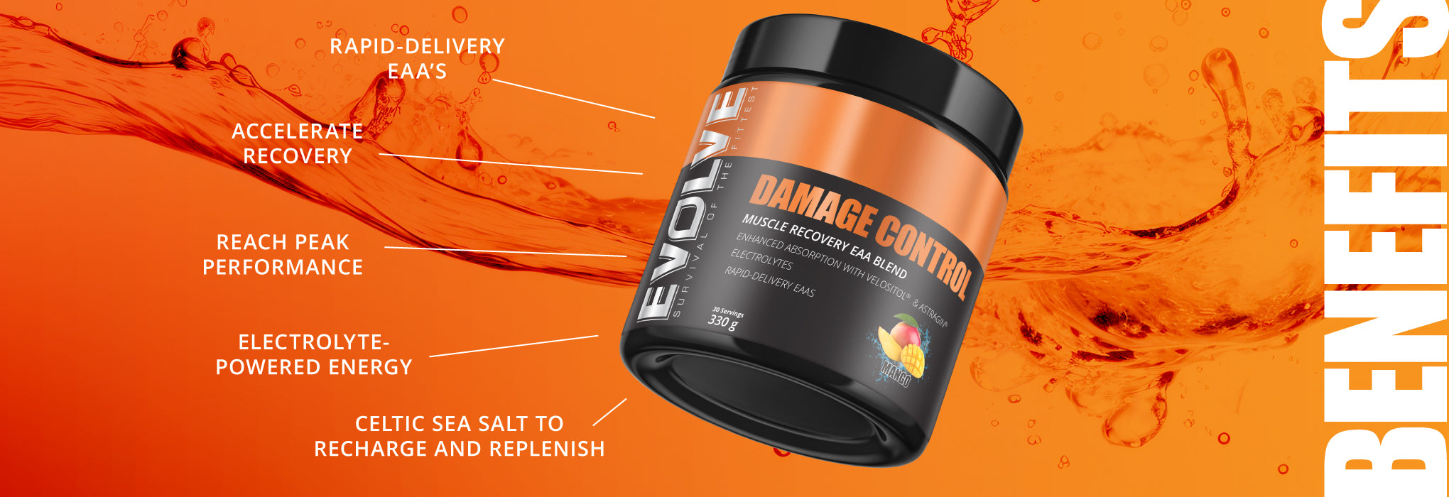 Evolve Damage Control + Electrolytes is a recovery and hydration matrix that contains all nine essential amino acids (EAAs). The formula contains an absorption matrix comprising of Velositol® and AstraGin® to increase the uptake of essential nutrients. With the addition of an electrolyte blend containing Celtic sea salt, magnesium, potassium, and calcium to rehydrate. It is best suited to those looking to rehydrate after intense exercise or working in hot climates.