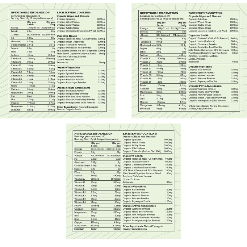 Each serve delivers 7g of certified organic Spirulina, Chlorella, Wheatgrass, Barley Grass, and Alfalfa Grass, superfoods traditionally used to nourish the body with naturally occurring vitamins and minerals.Milk thistle supports liver function, while digestive enzymes and prebiotic fibre help optimise digestion and nutrient absorption. No added sugar, artificial flavours, or synthetic vitamins, just the good stuff.