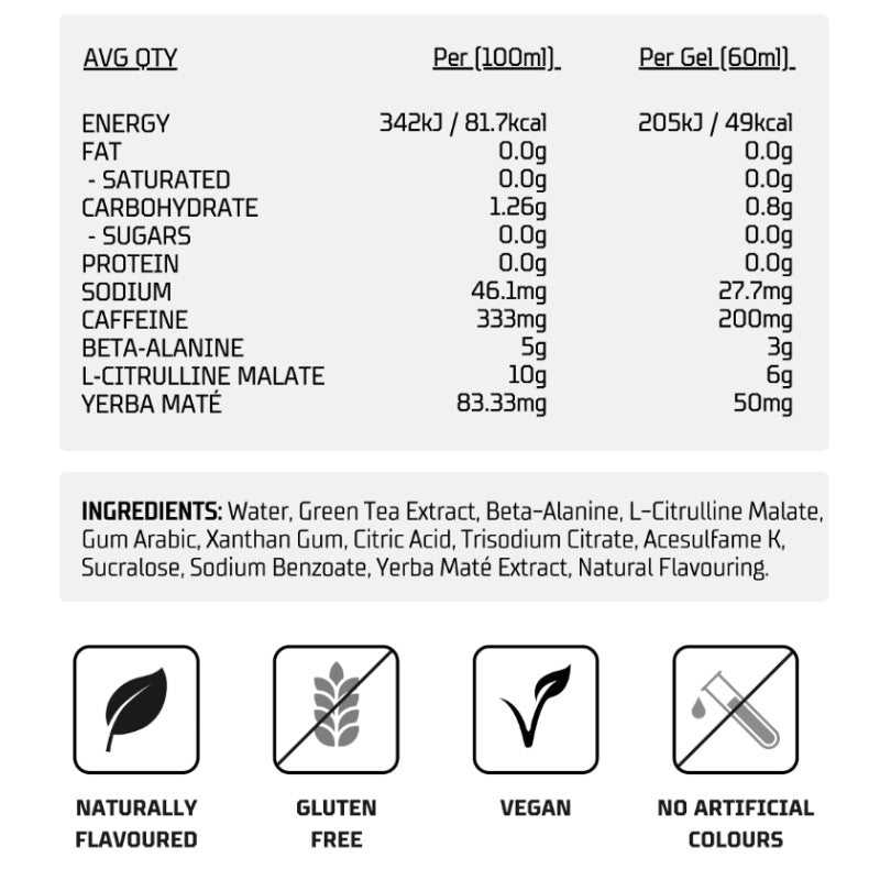 This concentrated formula combines beta-alanine to support muscular endurance and reduce perceived fatigue, with L-citrulline malate to help maintain oxygen delivery and support blood flow during intense efforts. The gel is naturally flavoured and designed for convenience, no mixing, no added water needed.