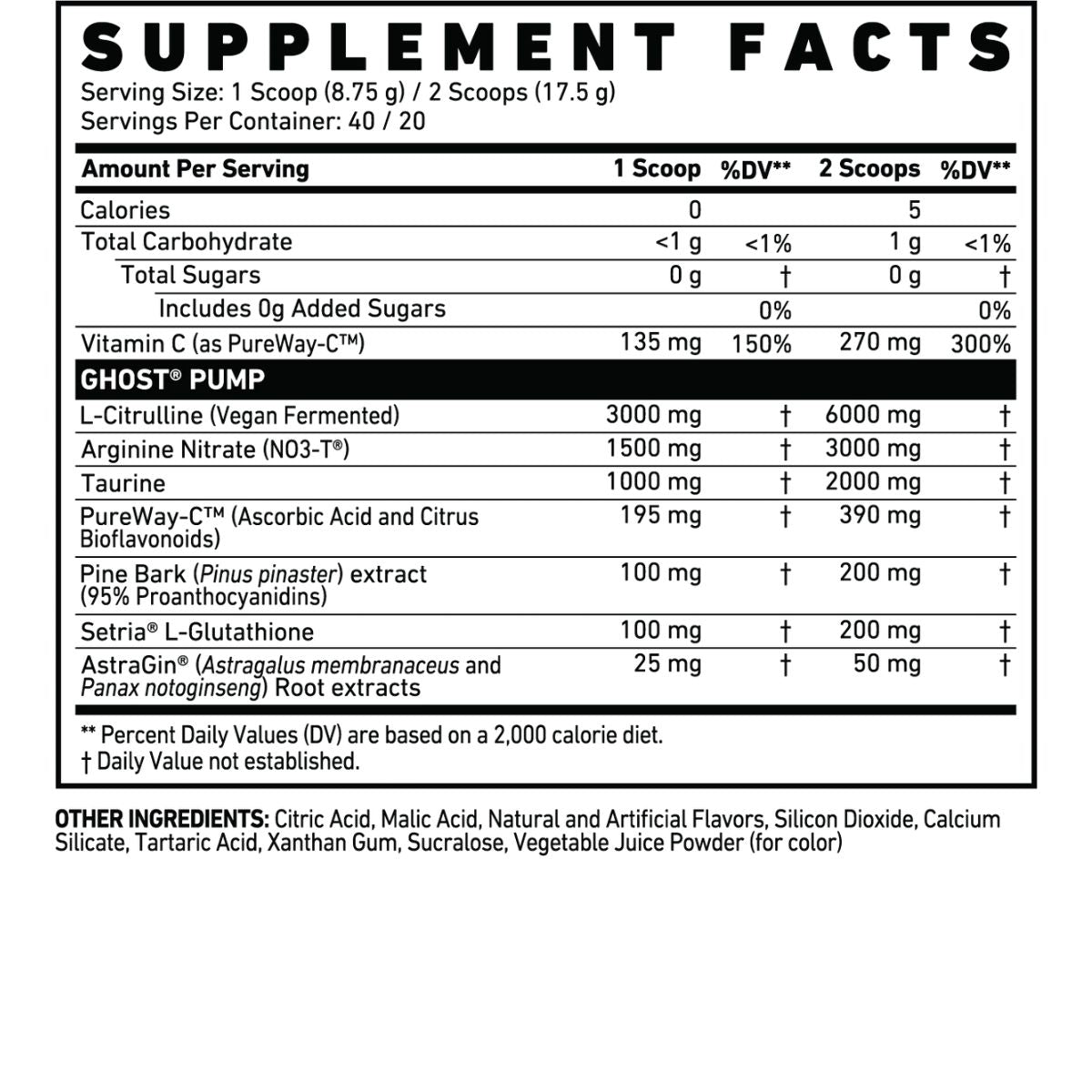 Mix one scoop (1 serving) of GHOST® PUMP with 6-8 oz of water or beverage of choice, such as GHOST LEGEND®, 30 minutes before exercise on training days. Advanced users/users over 160lbs, mix 1-2 scoops with 10-12oz of water prior to training