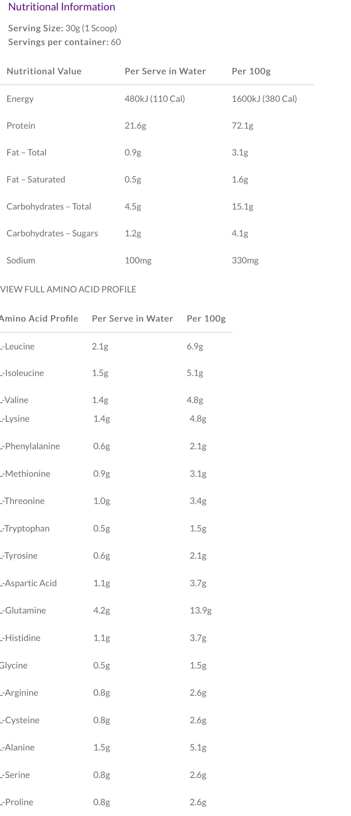 Add 2 – 4 scoops to a blender or shaker with 500 ml of water or whole milk and mix for 30 seconds until completely dispersed. Take 1 – 2 serves per day in addition to regular meals. Dosage may be adjusted up or down based on appetite and to meet training needs. (1 scoop = approx. 50g)