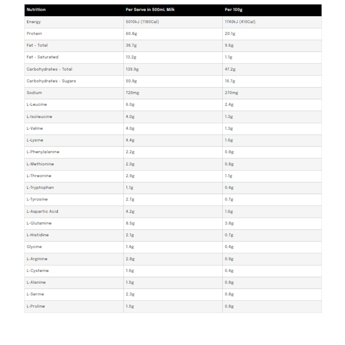 Add 2 - 4 scoops to a blender or shaker with 500 ml of water or whole milk and mix for 30 seconds until completely dispersed. Take 1 – 2 serves per day in addition to regular meals. Dosage may be adjusted up or down based on appetite and to meet training needs. (1 scoop = approx. 50g)