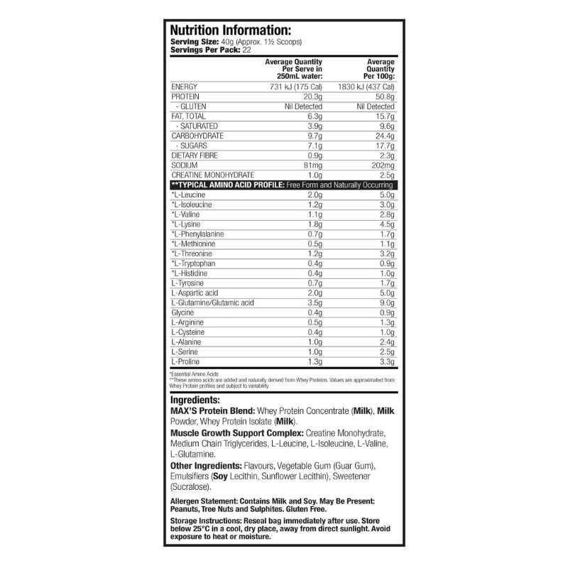 Max's Super Whey is engineered as a lean gainer for athletes who want quality muscle without the excess bulk. Each serve provides a precise balance of protein and carbs to support recovery, performance, and lean muscle growth, making it ideal for building size while staying defined.