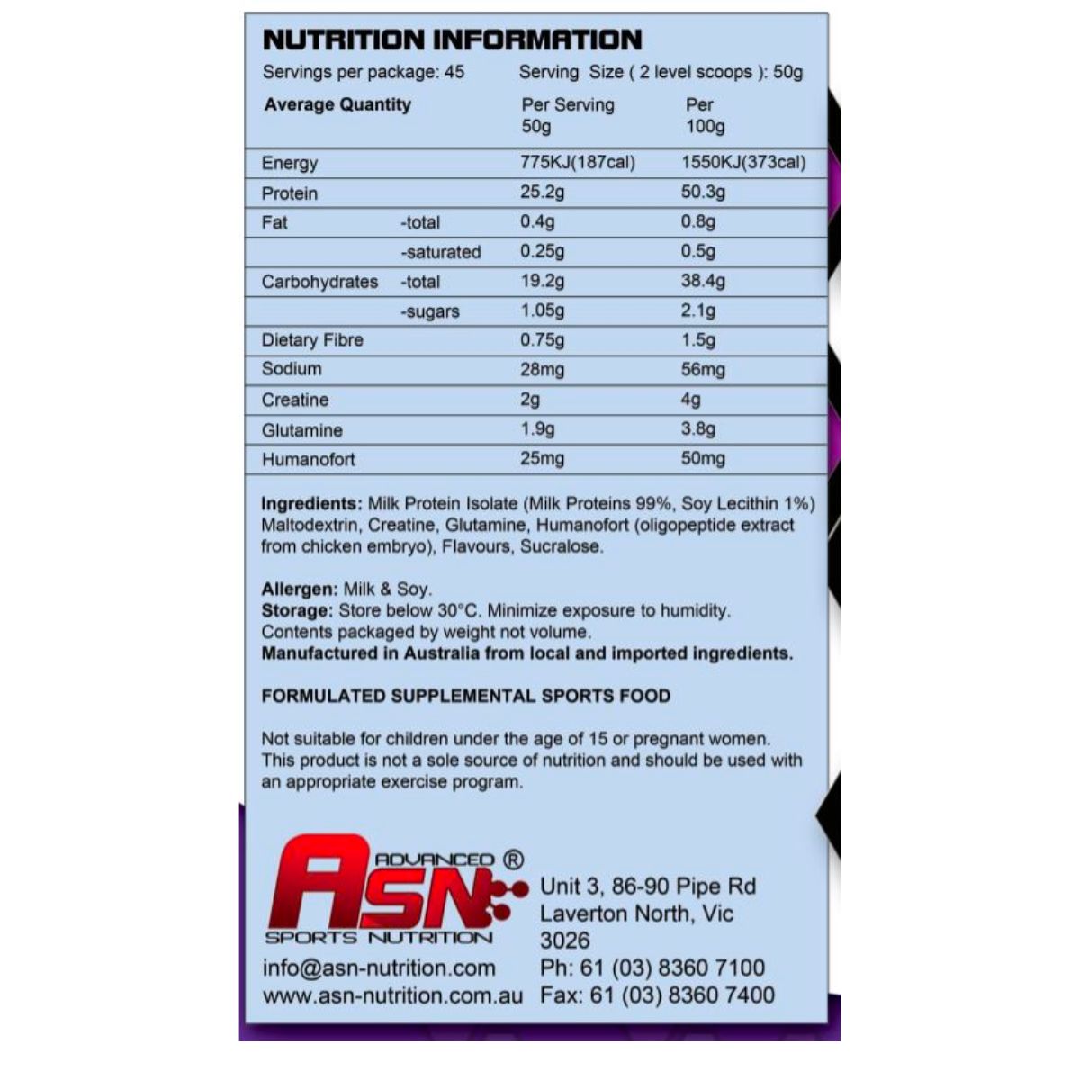 Advanced Sports Nutrition MP50 boasts a powerful blend of 25+ grams of milk protein isolate per serve, alongside added creatine, humanofort and glutamine. This unique combination ensures both rapid and sustained amino acid delivery, supporting immediate muscle repair and prolonged muscle protein synthesis. Enriched with essential amino acids and BCAAs, MP50 enhances muscle endurance, reduces fatigue, and supports recovery post-exercise. The formula is low in fat and sugar, making it an ideal choice for those focused on maintaining lean muscle mass while maximising their gains.