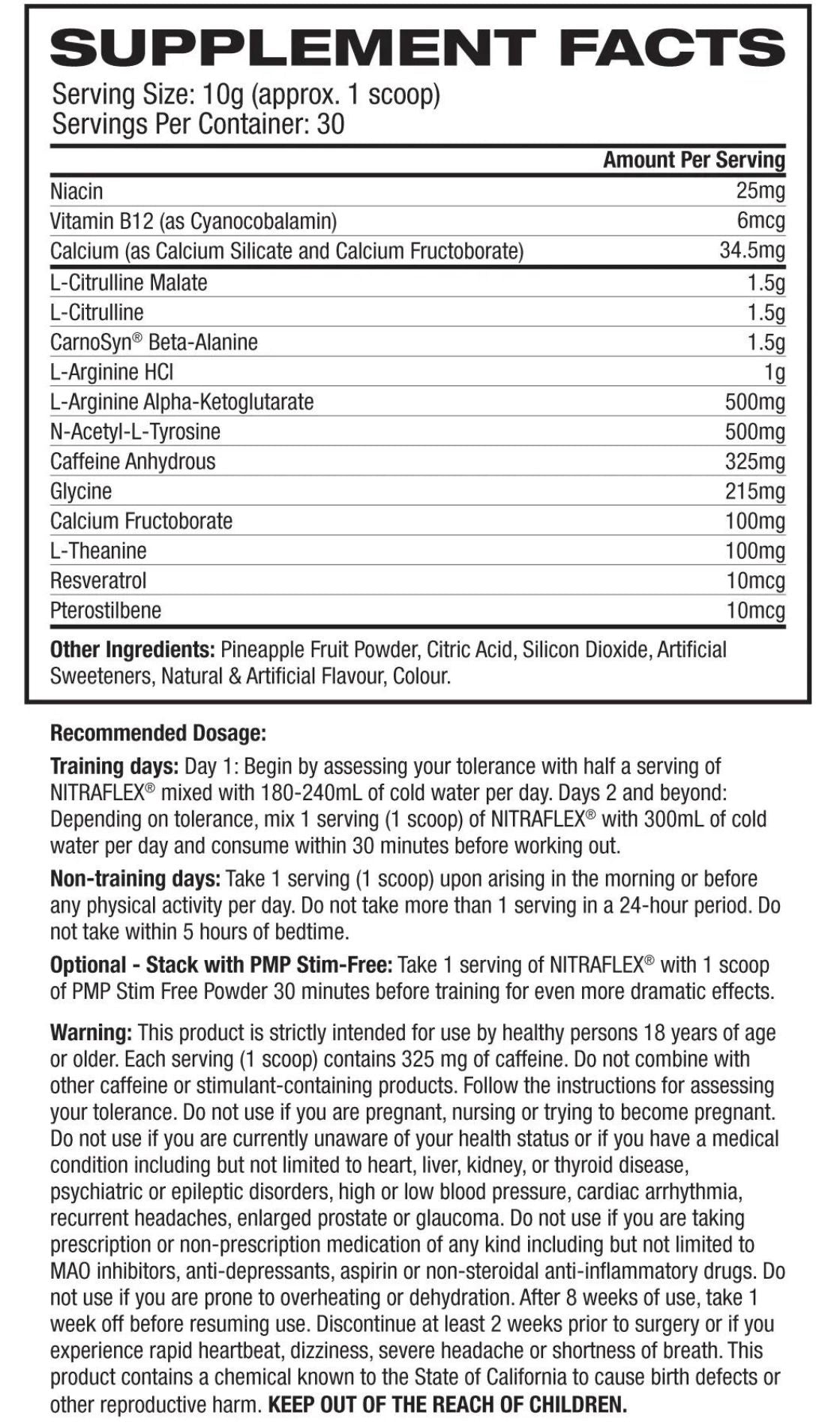 Take 1 serving of Nitraflex with 1 scoop of PMP Stim Free Powder 30 minutes before training for even more dramatic effects.