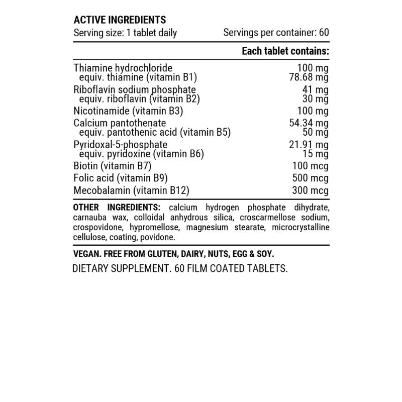 This formula features upper-level doses of mecobalamin (Vitamin B12 – 300 mcg) and Pyridoxal-5-phosphate (Vitamin B6 – 15 mg), along with activated B2 and other essential B vitamins. These nutrients help metabolise carbohydrates, proteins, and fats into usable energy, while supporting natural red blood cell production and nervous system function. The activated forms allow for more efficient absorption and utilisation by the body.