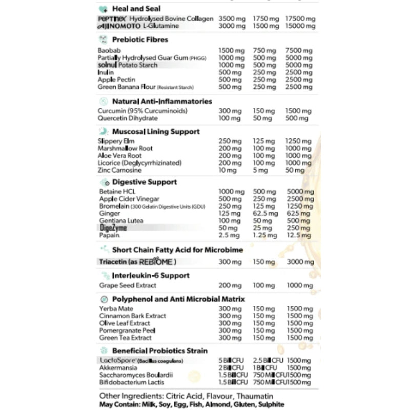 The formula blends collagen and glutamine to support gut lining health, along with prebiotic fibres like green banana flour and baobab to nourish beneficial bacteria. Soothing herbs such as slippery elm, aloe vera, and marshmallow root complement natural plant actives like curcumin and quercetin to help maintain digestive comfort. Added probiotics and postbiotics encourage microbial balance, while antioxidant-rich extracts including grape seed and green tea contribute to general health and wellbeing.