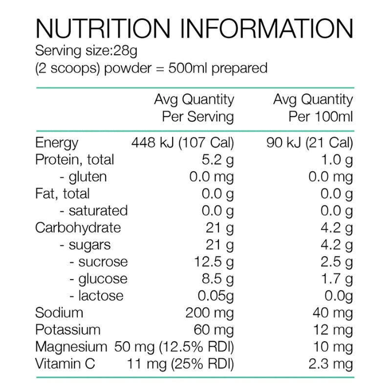 Each serve provides a 4.2% carbohydrate content from sucrose and glucose for fast, clean energy that’s easy on the stomach. Added whey protein isolate delivers 1g of protein per 100ml, helping support tissue repair during and after prolonged activity. A full electrolyte profile, sodium, potassium, magnesium, and calcium works to replace minerals lost in sweat, supporting hydration, muscle contraction, and endurance. Vitamin C is also included to contribute to general health and exercise recovery.