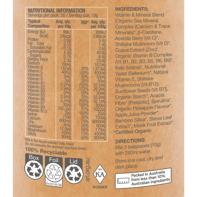 This formula includes vitamin C from acerola berry to support immunity, vitamin D from shiitake mushrooms for bone and muscle health, and zinc from guava extract for immune and skin support. B vitamins sourced from kelp, shiitake, and other natural ingredients assist with energy metabolism and nervous system function, while selenium from nutritional yeast supports thyroid health. Bamboo silica helps maintain healthy skin, hair, and nails, and acacia fibre with spirulina adds digestive and nutrient density benefits.