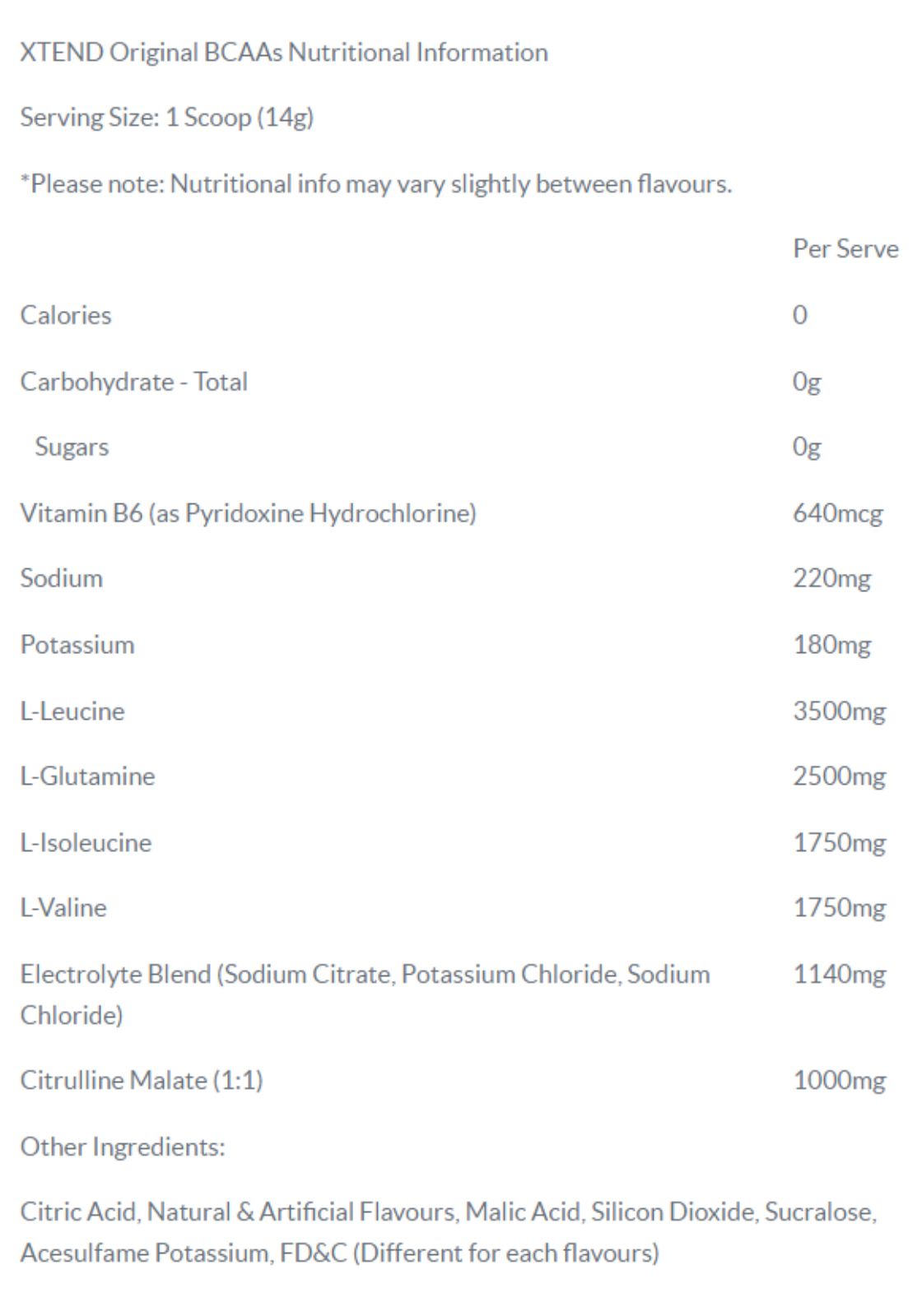 This blend of BCAAs can help repair your muscles, support your recovery and growth, promote muscle protein synthesis and increase your blood flow. Xtend BCAAs are presented in the clinically proven 2:1:1 ratio to support your muscles while you recover.With zero carbohydrates, calories or sugar, this powerful formula is the ultimate pre, intra & post-workout recovery tool to help you nourish and repair your muscles. This blend contains 7g BCAAs, 3.5g Leucine, and 1g Citrulline Malate combined with hydrating electrolytes to keep your body replenished.