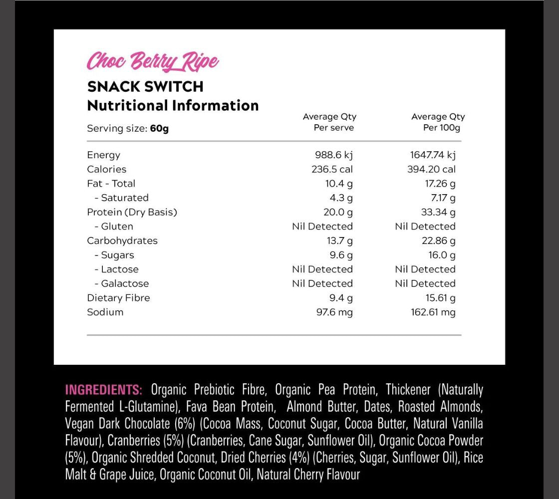 With over 20g of quality Organic Pea and Faba protein as well as 9g of gut-friendly prebiotic fibre per serve, Snack Switch is a 100% natural whole food bar suitable for the entire family to enjoy! Loaded with organic ingredients for optimal health, Switch has created a nutritious snack to support your daily nutritional requirements without compromising on amazing taste. Decadent and deliciously chunky, Snack Switch has been formulated with roasted nuts, vegan dark chocolate, and nut butter (good fats), not to mention the recovery and gut-supporting Benefits of L-Glutamine. Switch Nutrition has really thought of it all with this plant-based, high-protein snack!