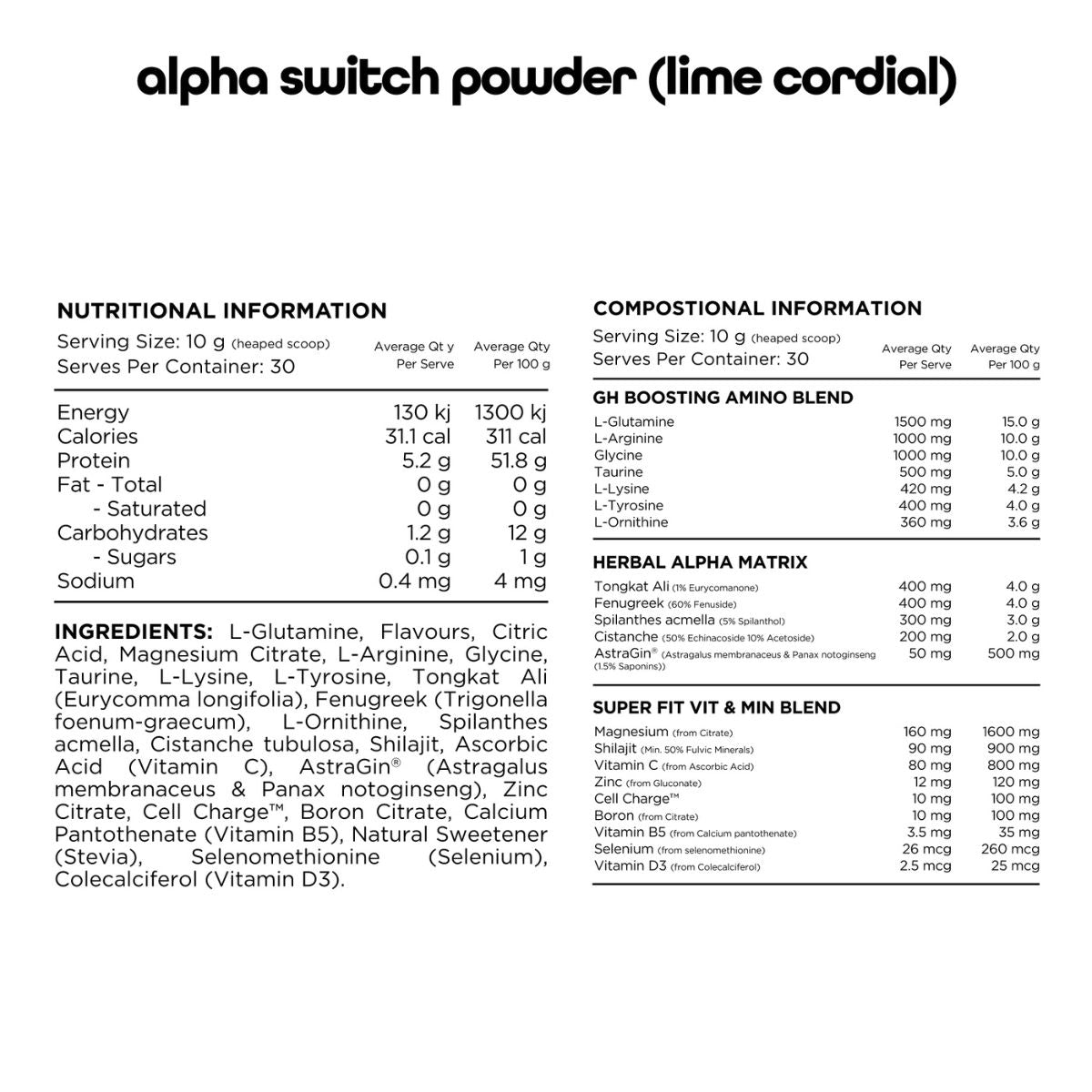 The formula of Alpha Switch includes ingredients such as arginine, glutamine, ornithine, lysine, taurine, tyrosine, and more. Notably, they have chosen cistanche, which has a long history of use in Traditional Chinese Medicine, as an alternative to ashwagandha. With tongkat ali at 100:1 extract and 1% eurycomanone, Alpha Switch also includes spilanthes and fenugreek, which offer benefits to promote muscle recovery. Furthermore, the supplement incorporates essential nutrients like vitamin D, boron, zinc, magnesium, vitamin B5, and selenium, as well as potent compounds such as shilajit, Cell Charge™, and AstraGin®, to promote overall balance.