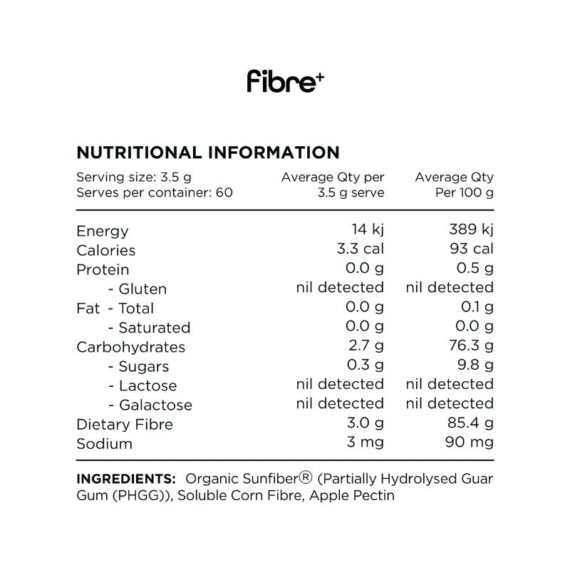 Fibre+ is designed to nourish your gut from the inside out. Its carefully selected combination of Organic Partially Hydrolysed Guar Gum (PHGG), Apple Pectin, and Corn Fibre works to support the growth of beneficial gut bacteria. By promoting a healthier digestive environment, it contributes to smoother digestion and helps maintain a well-balanced microbiome.