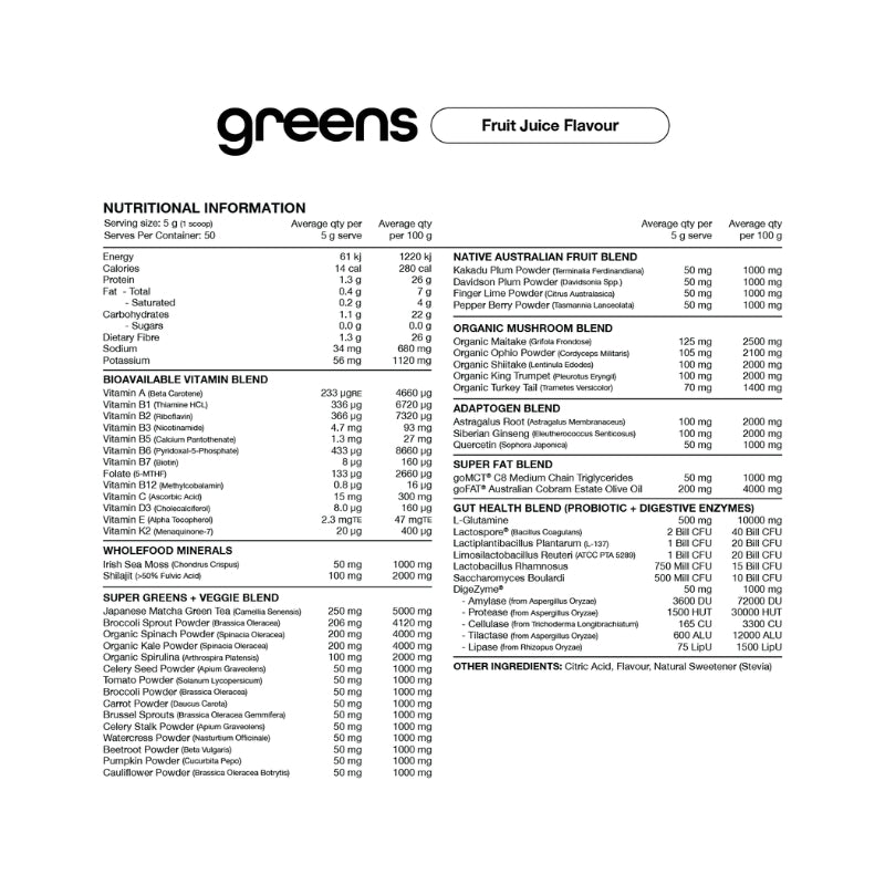 Adaptogens like astragalus and ginseng, combined with a 2000mg organic mushroom blend, help regulate stress, promote balance, and support long-term wellbeing. These powerful compounds work together to keep your body strong, focused, and ready to perform every day — ideal for busy professionals, active individuals, or anyone looking for a clean daily greens formula that goes beyond the basics.