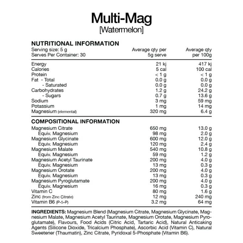 Multi-Mag contains six highly bioavailable forms of magnesium, each chosen for its unique benefits, supporting muscle recovery, nervous system health, energy production, and mental clarity. Most magnesium products only offer one or two types; Multi-Mag delivers a more complete recovery solution, backed by supportive nutrients like Vitamin C, Zinc, and P5P (Vitamin B6).