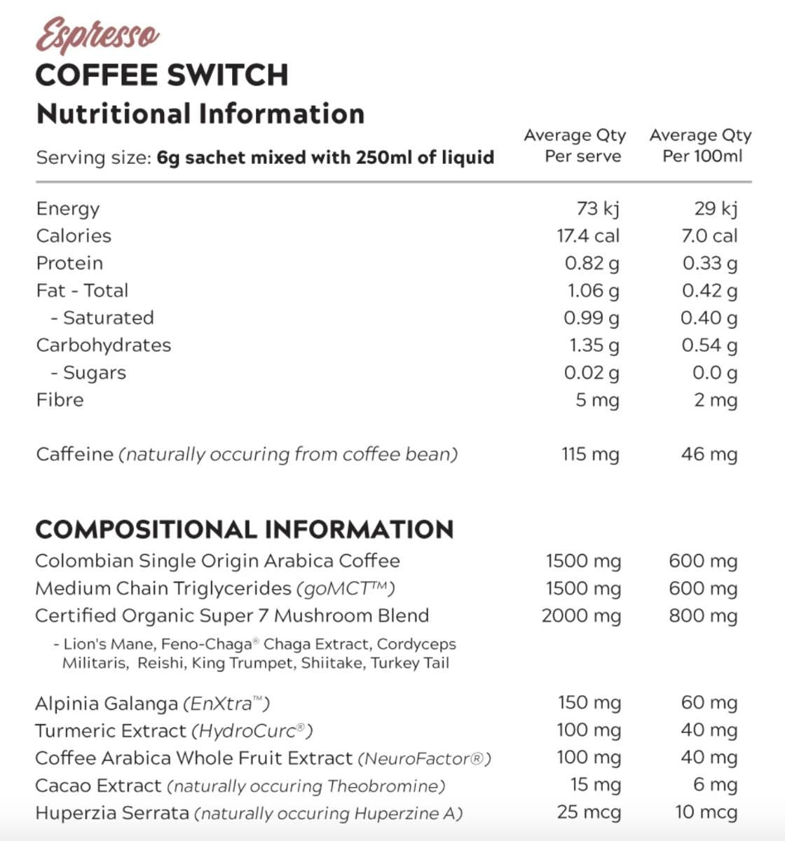 Utilising the age-old Benefits of nootropic botanicals and organic mushrooms, carefully selected premium Colombian Single Origin Arabica Coffee Beans, and award-winning ingredients, EnXtra™ (Alpinia Galanga), Lion's Mane, Coffea Arabica Fruit (Neurofactor'®), Theobroma Cacao, Huperzia Serrata and more, this deliciously powerful brew will make you wonder why you ever settled for less. The cherry on top? The goodness doesn't stop there. Switch Nutrition Coffee Switch also contains a 7 Certified Organic Mushroom Blend, Turmeric and goMCT to deliver healthy fats to supply naturally occurring C8 (caprylic) and C10 (capric) Medium Chain Triglycerides (MCTs) and prebiotic acacia fibre.