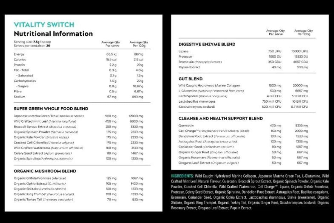 Flip the switch on your nutrition game with Vitality Switch—the ultimate greens powder that's anything but boring. Packed with 42 whole food ingredients across seven functional blends, this powerhouse delivers everything your body's been craving in a single scoop. From gut-loving probiotics to energy-boosting adaptogens, it's your daily nutritional safety net that actually tastes good. Say goodbye to nutritional gaps and hello to the vitality you deserve. One scoop, endless possibilities.