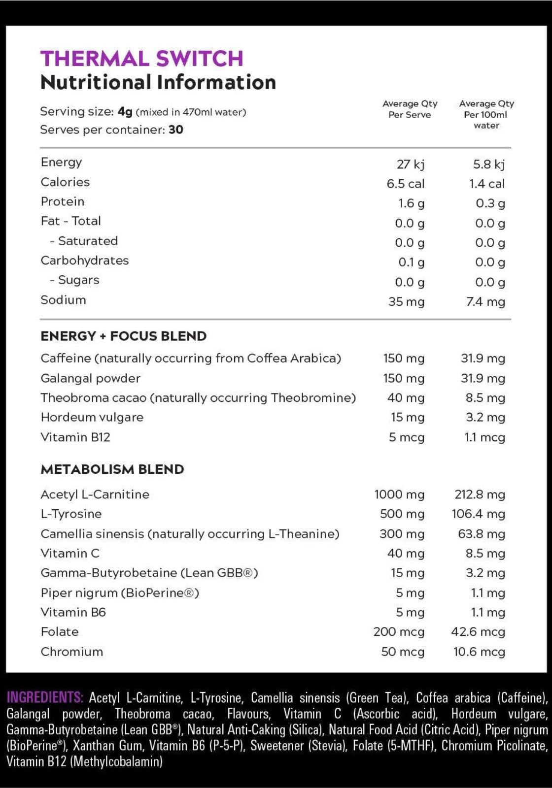 Thermal Switch is carefully crafted with standardised plant extracts, antioxidants, amino acids, and essential co-factors to deliver a potent blend of key ingredients. From acetyl L-carnitine to naturally sourced caffeine, EGCG from green tea, L-tyrosine and BioPerine, this formula is designed to support your body goals and assist your performance naturally.